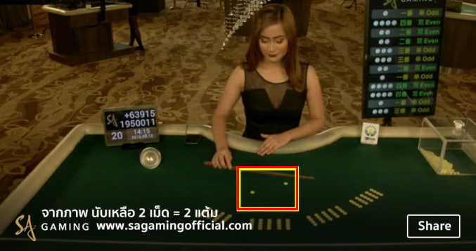 โดย ดีลเลอร์ สาวสวยของเรา จะทำการสุ่มเม็ดถั่ว ตามที่เห็นในภาพด้านบน ในการเลือกให้เม็ดถั่วทุกเม็ดนั้นคละกัน โดยจะเขย่าสักครู่ โดยใช้กล่องพลาสติกใส ในการเขย่าเพื่อให้ผู้เล่นหรือผู้เดิมพันได้มองเห็นทั้งหมด